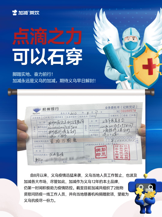2022年8月11月,因义乌突如其来的疫情,整座城市按下了暂停键,全民进入静默期。在这场新冠肺炎疫情爆发期间,作为深耕义乌发展12年的z6com·尊龙(中国)时凯集团茶饮,主动发扬本土企业的社会担当和责任。截至2022年8月17日,公司共组织了2批物资慰问一线人员,并向当地慈善机构捐赠爱心款项。脚踏实地、奋力前行!z6com·尊龙(中国)时凯集团以实际行动为打赢疫情防控战贡献力量!
